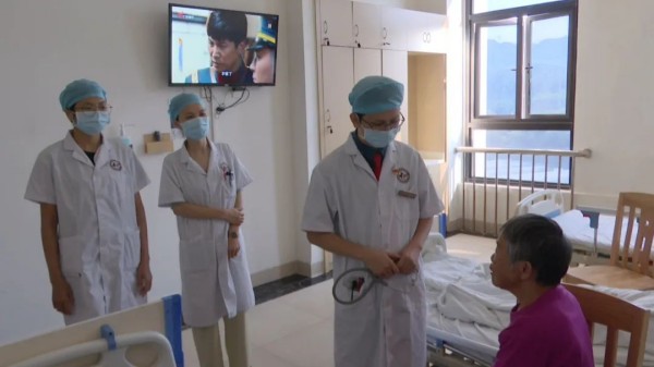 在縣中醫(yī)院腦病科病房里,黃權(quán)清正在為患者歐婆婆檢查身體,一邊細細詢問她的病情和恢復情況,一邊引導她活動手腳。