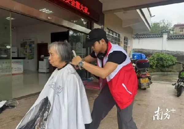 佛岡縣7號造型理發(fā)店理發(fā)師到下岳村為轄區(qū)長者進行義剪。龍山鎮(zhèn)供圖