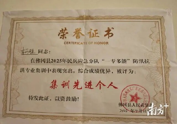 退役軍人李萬勝在佛岡縣2025年民兵應急分隊“一專多能”防汛抗洪專業(yè)集訓中獲得榮譽。龍山鎮(zhèn) 供圖