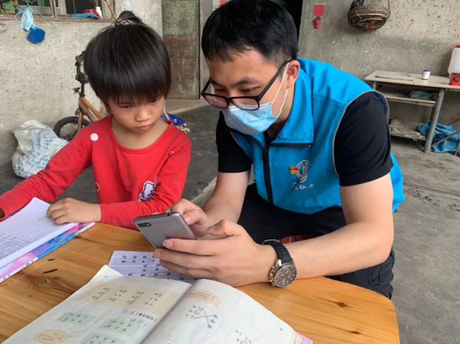 黃杰銘同志協(xié)助困境女童完成網(wǎng)課。來源:縣文明辦 團(tuán)縣委